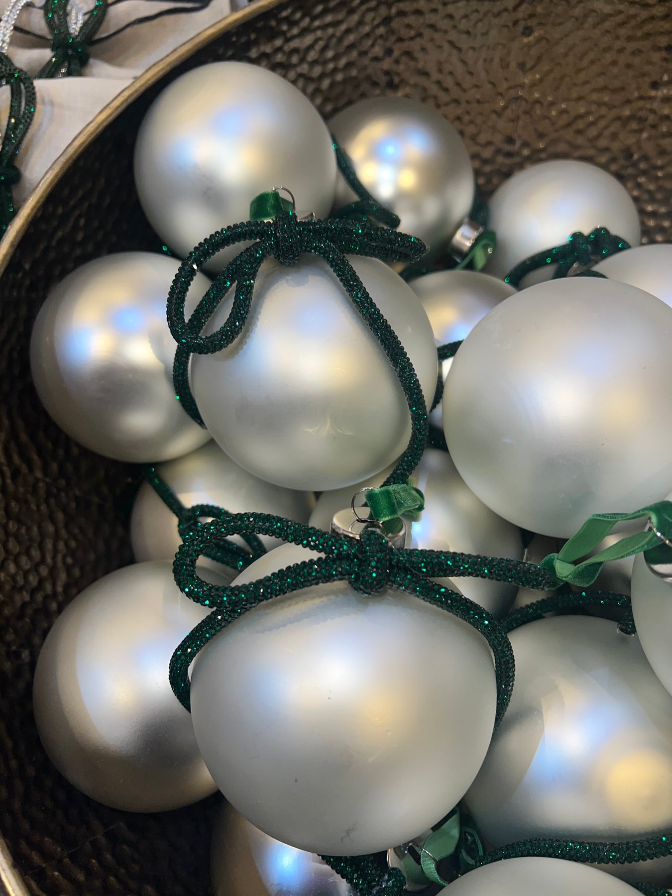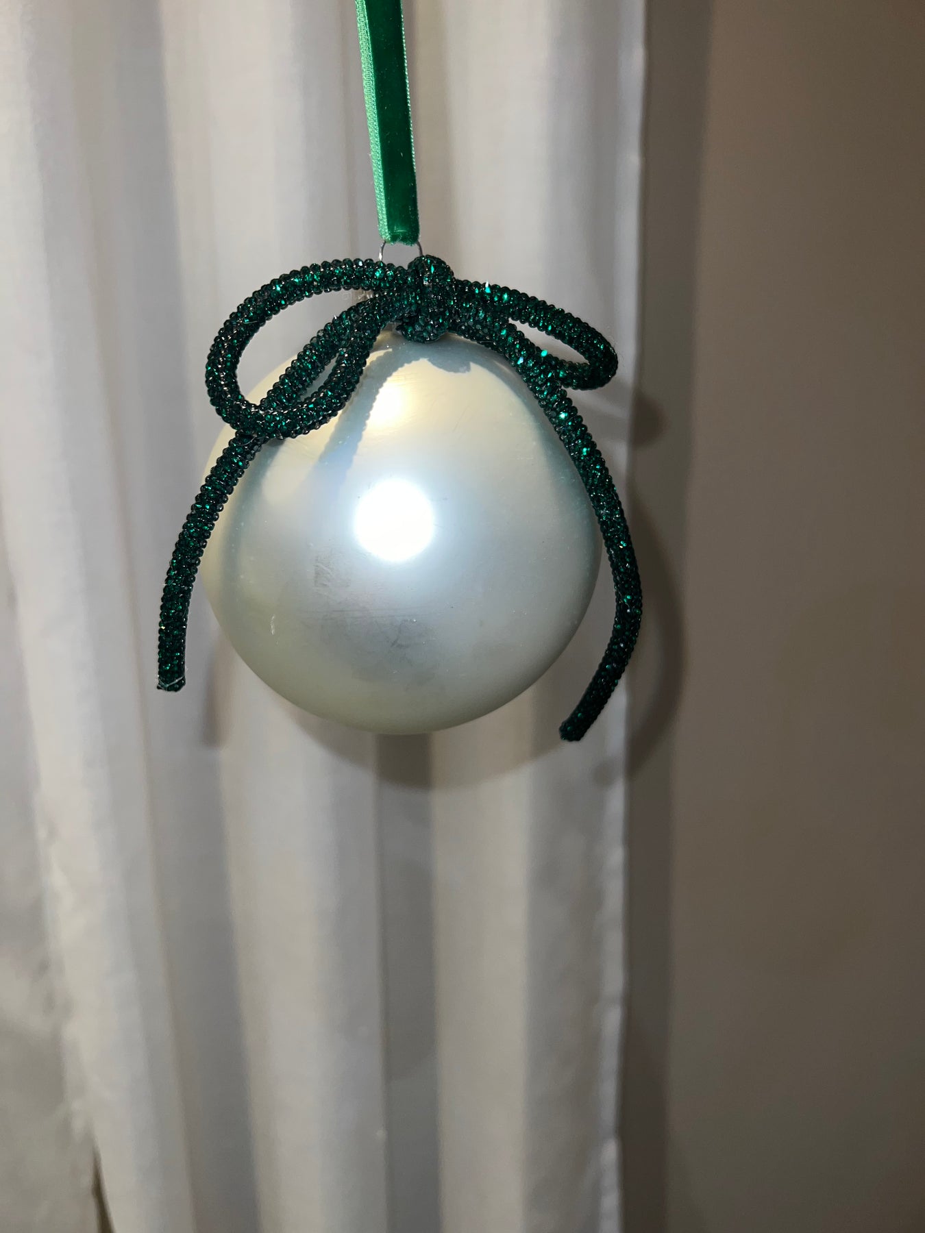 Large pearlised bauble featuring a sparkly emerald green bow on top