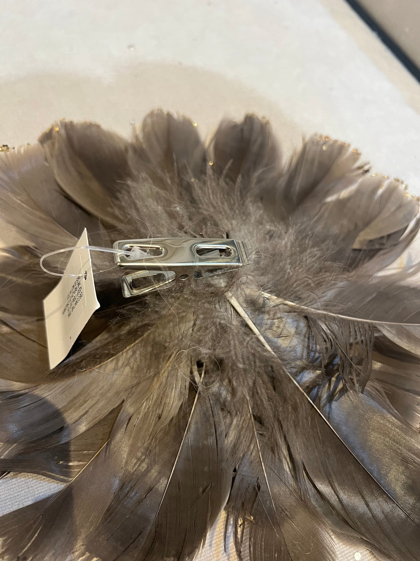 A large brown feather flower clip with gold glitter and a pearl centre